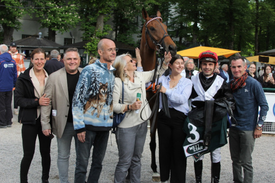 Kevin Braye (rote Kappe) mit Entourage nach dem Sieg auf Doro am 17. Mai 2025 in München Photo von Murat Fischer |